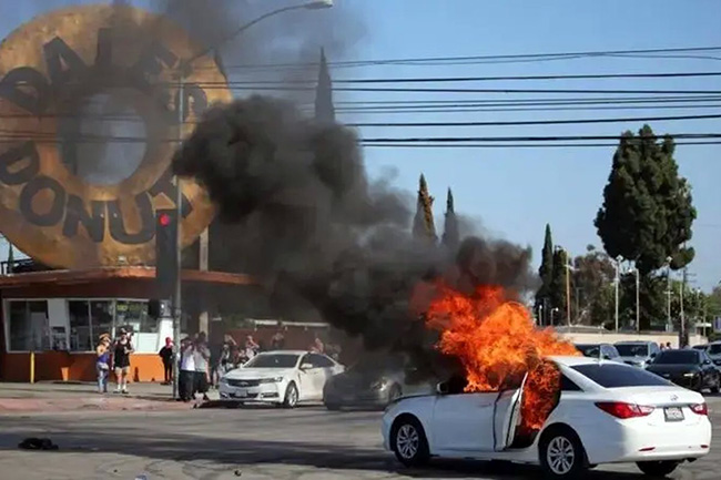 Suasana kerusuhan di Los Angeles (LA) Amerika Serikat (AS) pada Sabtu (7/6/2025).(Tangkapan layar via BBC)