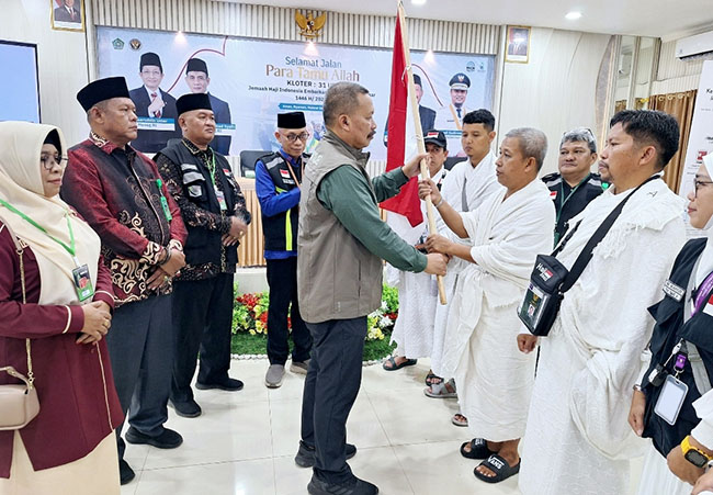 JH Sultra yang tergabung dalam kloter 31 ini dilepas secara resmi di aula Mina Asrama Haji Sudiang Makassar oleh Ketua PPIH Embarkasi Makassar, H. Ali Yafid, yang ditandai penyerahan bendera merah putih kepada ketua kloter.