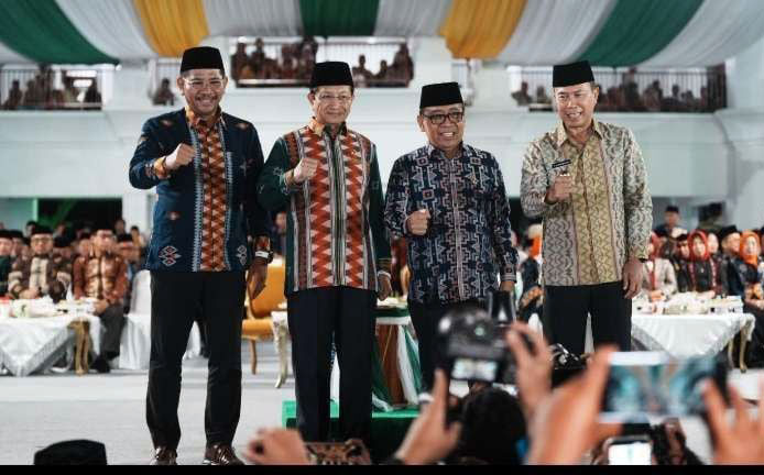 Dari kiri ke kanan) Dirjen Bimas Islam Kemenag Abu Rokhmad, Menteri Agama Nasaruddin Umar, Menko PMK Pratikno bersama Menteri Agama Nasaruddin Umar dan Gubernur Sultra Andi Sumangerukka berfoto bersama disela-sela pembukaan Seleksi Tilawatil Qur’an dan Musabaqah Al-Hadits (STQH) Nasional XXVIII Tahun 2025 di Tugu Persatuan, Kota Kendari, Sulawesi Tenggara, Sabtu (11/10/2025), malam (Foto: Dokumentasi/Kemenag)